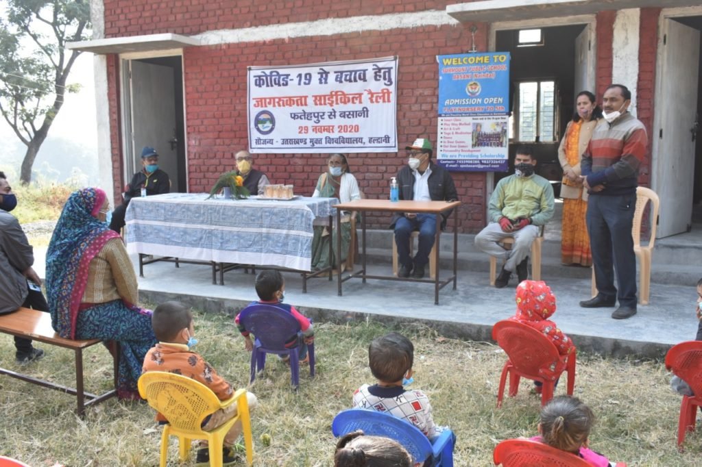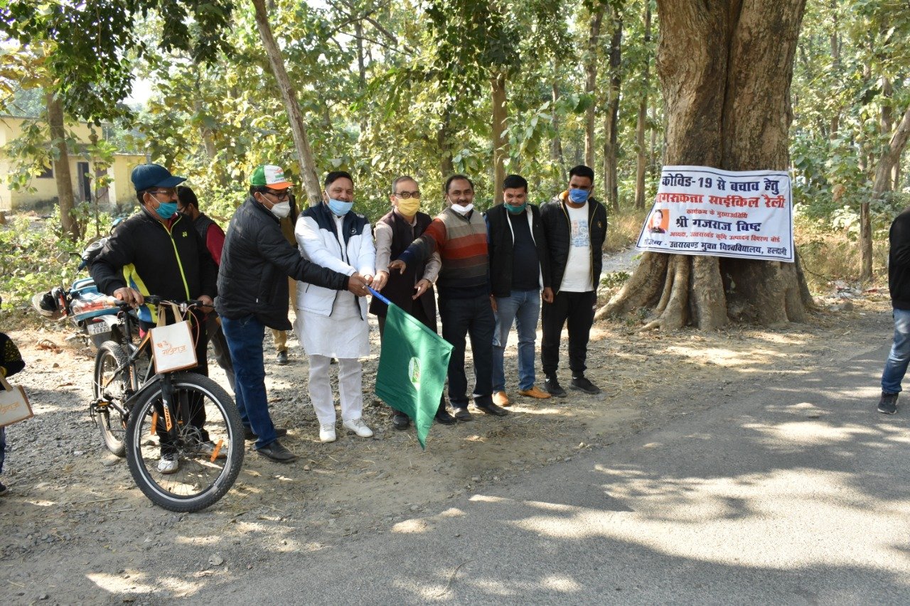 हल्द्वानी(बसानी)। उत्तराखण्ड मुक्त विश्वविद्यालय द्वारा कोविड-19 को लेकर जागरूकता कार्यक्रम के तहत फतेहपुर बावनडाठ से बसानी तक साईकिल रैली निकाली गयी। जिसके द्वारा “हिट इंडिया, फिट इंडिया” का संदेश भी दिया गया। रैली को दर्जा मंत्री गजराज बिष्ट व यूओयू के कुलसचिव प्रो. गोविन्द सिंह द्वारा हरी झंडी दिखाकर रवाना किया गया।