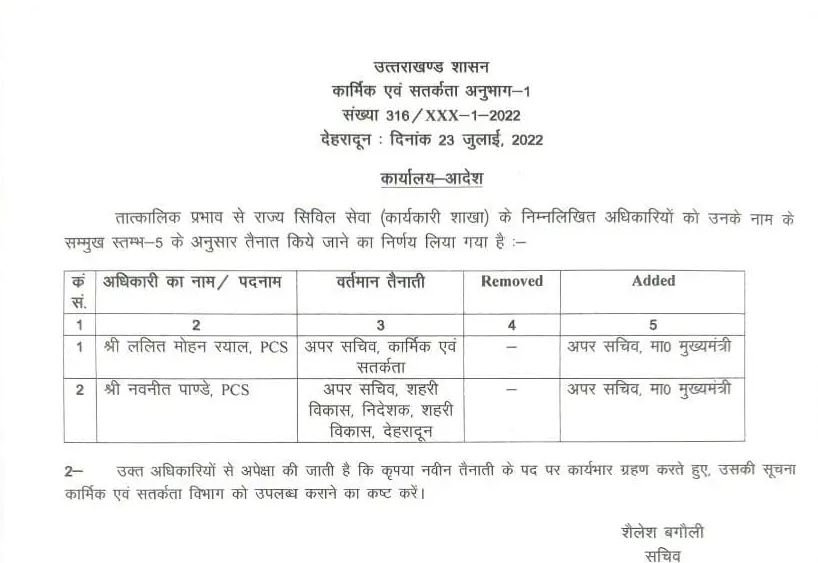 Dehradun News: उत्तराखंड शासन से आज की बड़ी खबर सामने आ रही है राज्य के वरिष्ठ पीसीएस अधिकारी ललित मोहन रयाल को अपर सचिव कार्मिक एवं सतर्कता के साथ ही अपर सचिव मुख्यमंत्री की बड़ी जिम्मेदारी मिली है। उधर नवनीत पांडेय को अपर सचिव शहरी विकास के साथ ही अपर सचिव मुख्यमंत्री की जिम्मेदारी दी गयी है।