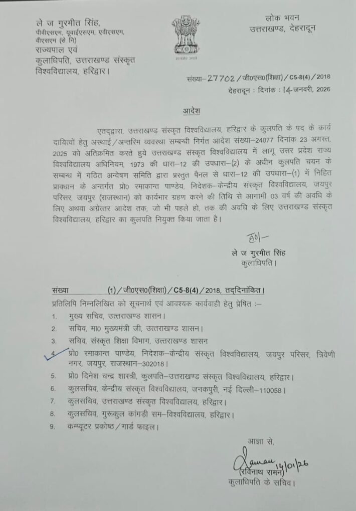 राज्य सरकार ने उत्तराखंड संस्कृत विश्वविद्यालय के कुलपति पद को लेकर बड़ा प्रशासनिक निर्णय लिया है। जारी अधिसूचना के अनुसार प्रो. समकाल पांडेय को विश्वविद्यालय का नया कुलपति नियुक्त किया गया है। उनकी नियुक्ति तीन वर्ष की अवधि के लिए अथवा अगले आदेश तक मान्य रहेगी।